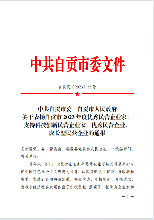 中共自貢市委,自貢市人民政府關(guān)于表?yè)P(yáng)自貢市 2023 年度****民營(yíng)企業(yè)家支持科技創(chuàng)新民營(yíng)企業(yè)家、****民營(yíng)企業(yè)成長(zhǎng)型民營(yíng)企業(yè)的通報(bào) | ||