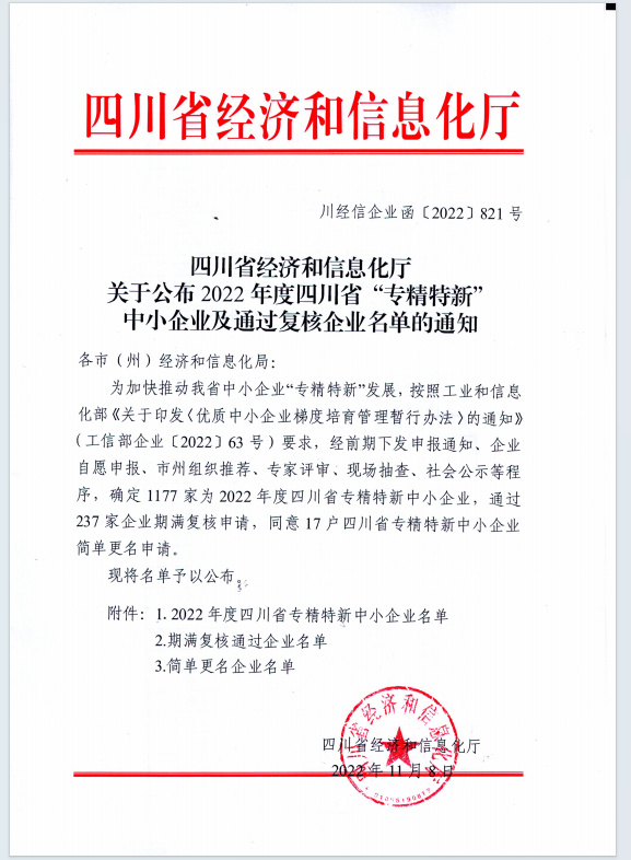 四川省經(jīng)濟(jì)和信息化廳關(guān)于公布 2022年度四川省“專精特新中小企業(yè)及通過復(fù)核企業(yè)名單的通知 | ||